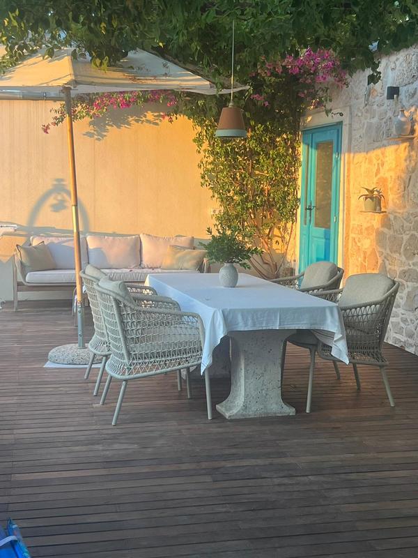 Za hišo se nahaja manjša terasa (15 m2) z mizo in stoli za pet oseb, od koder je pogled na mediteranski vrt (limone, pomaranče in zelišča). Iz apartmaja lahko skozi okna s čudovitimi kamnitimi oboki opazujete morje, barkice ter majhne otočke, ki so raztreseni po turkizni morski gladini.